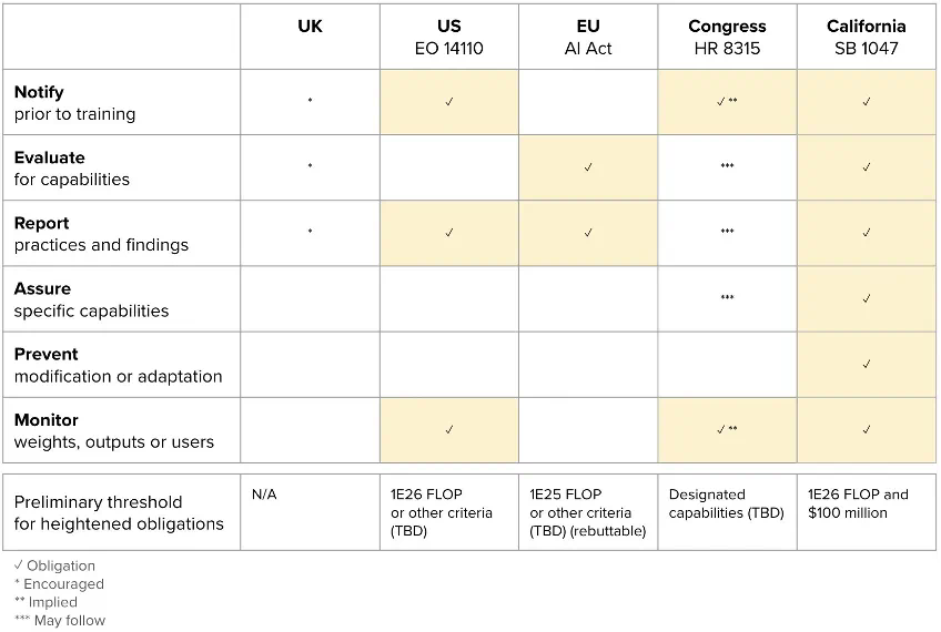 英国、美国、欧盟和美国(包括前述加州法案 SB 1047)针对前沿人工智能模型的监管措施对照,用勾号、星号和 N/A 表示是否强制要求、鼓励或暗示采取相应的监管措施,包括对模型权重和计算能力 (FLOP) 的要求。来源:Stability AI 公共政策专家 Ben Brooks@opensauceAI,他曾在 GoogleX、Uber 和 Coinbase 等公司工作。