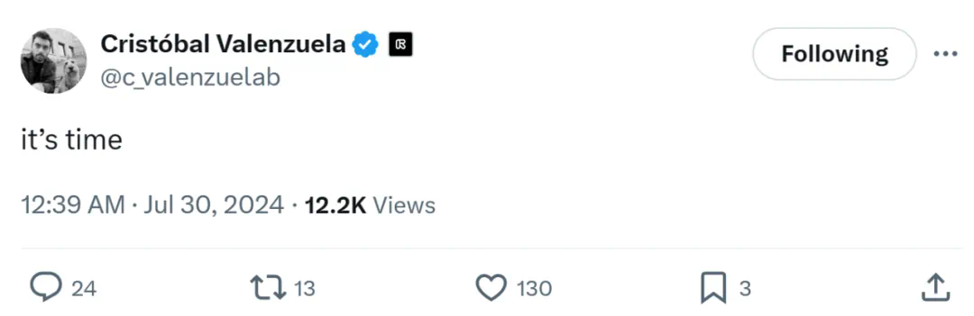 Runway 联合创始人兼 CEO Cristóbal Valenzuela 发推表示,是时候了(脑补:给视频生成领域再来波小小的震撼了)。