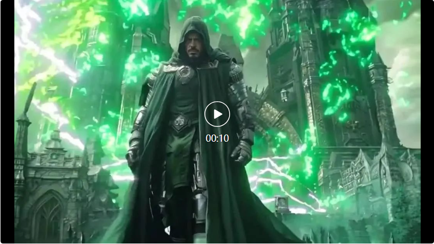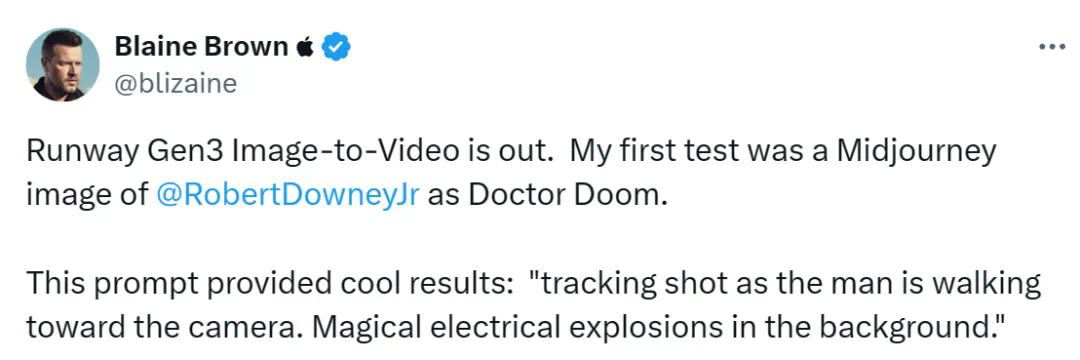 X 用户 @blizaine 测试了一张 Midjourney 生成的小罗伯特・唐尼即将扮演的毁灭博士,使用到的 Prompt 为「当男人走向相机时跟踪拍摄,背景中有神奇的电气爆炸。」
