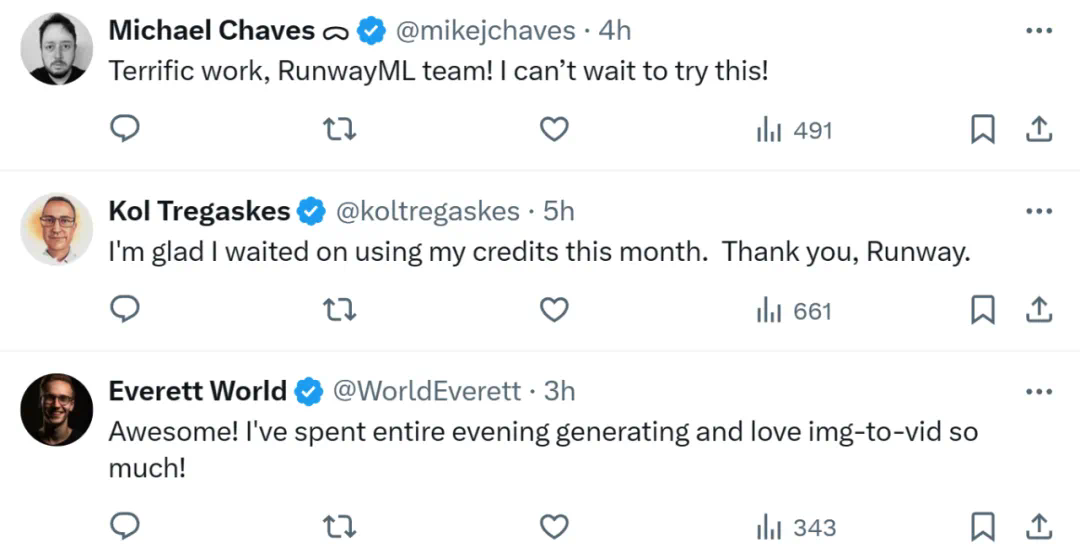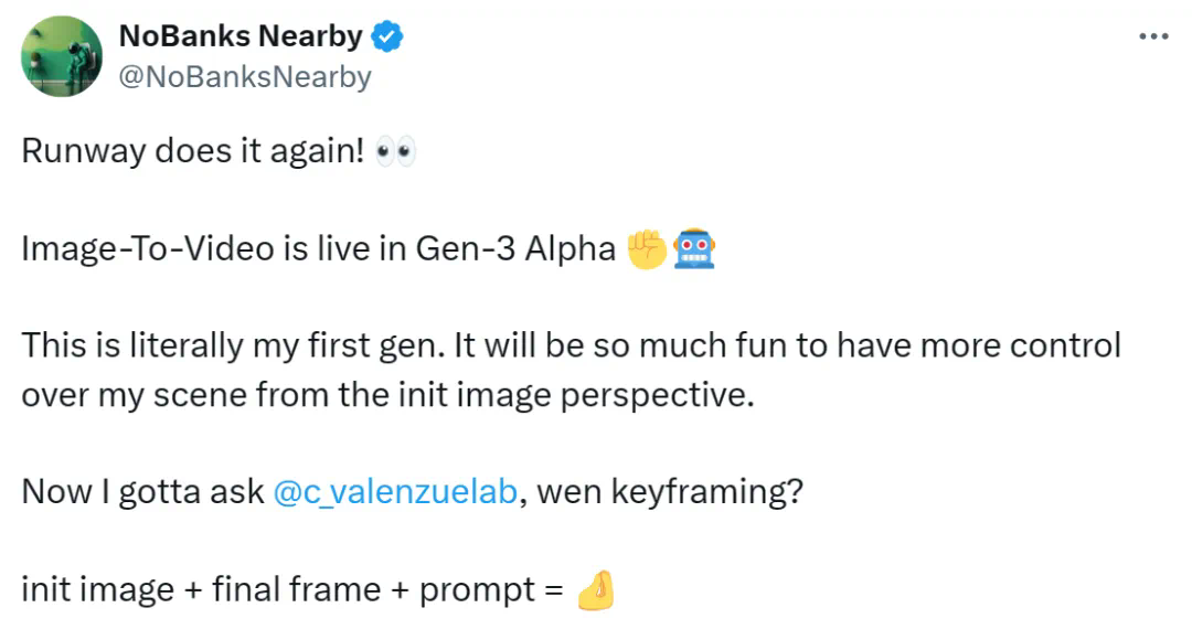 当然已经有人用上了,X 用户 @NoBanksNearby 在试用后表示,「Runway 在图生视频领域又做到了很好。」