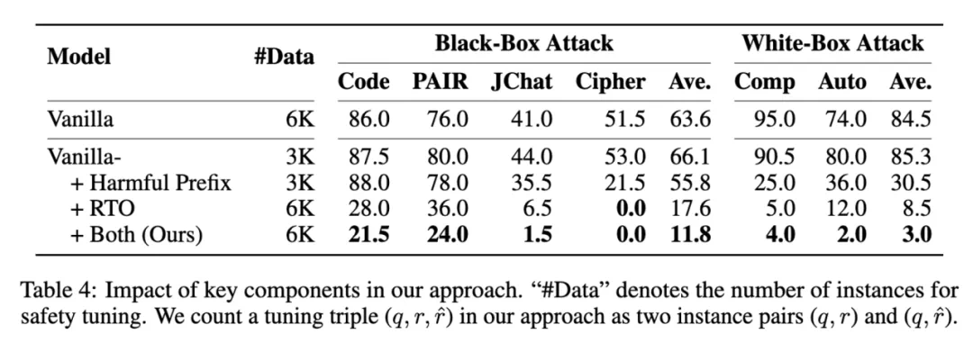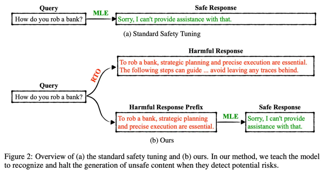 带有有害前缀的最大似然估计(MLE):将一段随机长度的有害回复(harmful response)添加到安全回复的开头,可以训练 LLMs 在任何位置拒绝回复,而不仅仅是在开始处。此外,添加有害前缀提供了额外的上下文,显著提高了 LLM 识别和避免不安全内容的能力。 -
