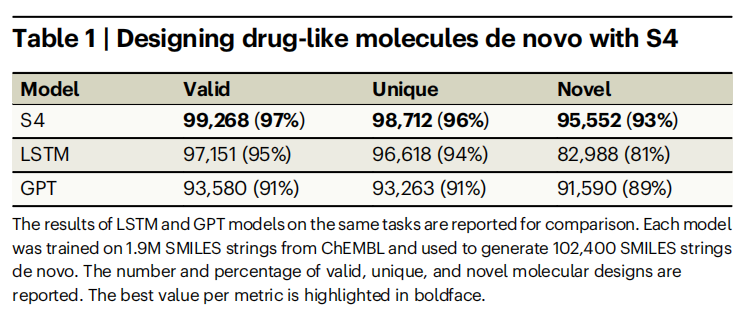 首先,对 S4 进行了分析,以了解其设计从 ChEMBL 数据库中提取的类药物小分子(SMILES 长度低于 100 个 tokens)的能力。