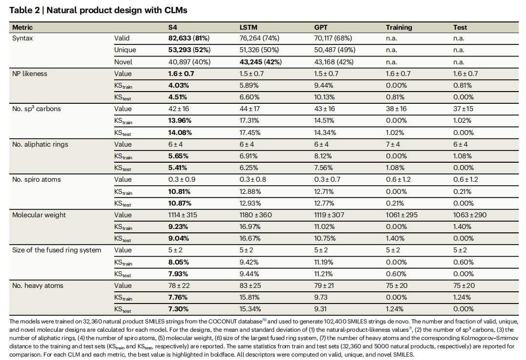 所有 CLM 都可以设计天然产物,但与类药物分子相比,其性能较低。S4 设计的有效分子数量最多,比 S4 多出约 6000 到 12,000 个分子(好 7-13%),而 LSTM 的新颖性最高,比 S4 多出约 2000 个分子(2%)。
