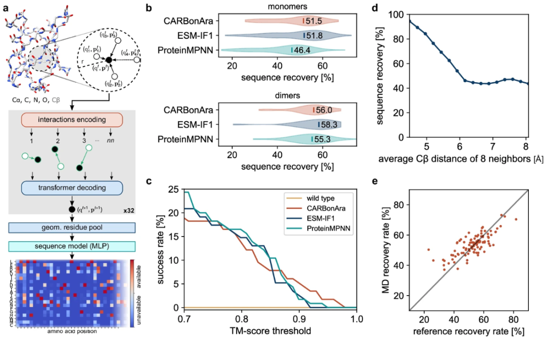 研究人员通过将 CARBonAra 应用于分子动力学 (MD) 模拟的结构轨迹来表征该方法的稳健性。由于主链构象变化和先前显示低恢复率的病例增加,序列恢复率(53±10%)与一致预测(54±7%)没有显著下降。