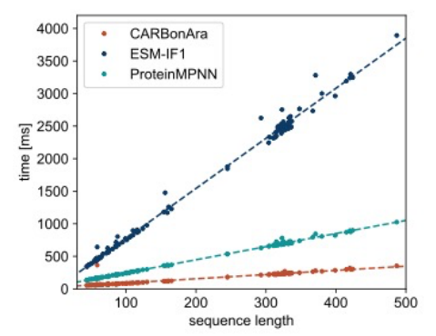 对于从不含非蛋白质分子的骨架结构中分离蛋白质或蛋白质复合物的序列设计,CARBonAra 的表现与 ProteinMPNN 和 ESM-IF1 等最先进的序列预测方法相当,并且计算成本具有竞争力(在 GPU 上比 ProteinMPNN 快约 3 倍,比 ESM-IF1 快 10 倍)。