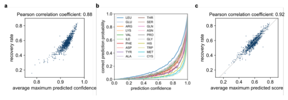 实际上,这些置信度可以被解释为并映射到概率中,通过表征在给定每种氨基酸类型的预测置信度的情况下正确预测的概率。