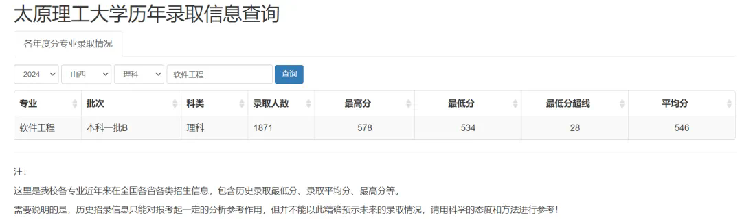 根据官网查询到的准确消息,今年太原理工大学软件工程录取人数实为 1871 人(山西考区,原计划为 1795 人),最高分是 578 分,最低 534 分,平均 546 分。