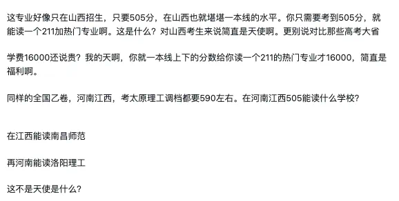 还有在读学生现身说法,相对高昂的学费放眼全国是普遍现象,教学质量有国家背书,最重要的是,对于「本省人」来说,花相对较高的学费获得了「211 title」与好专业(这两项无疑是就业简历上最重要的元素),只能说是捡到大便宜了,又怎么能认为是不划算的买卖呢?