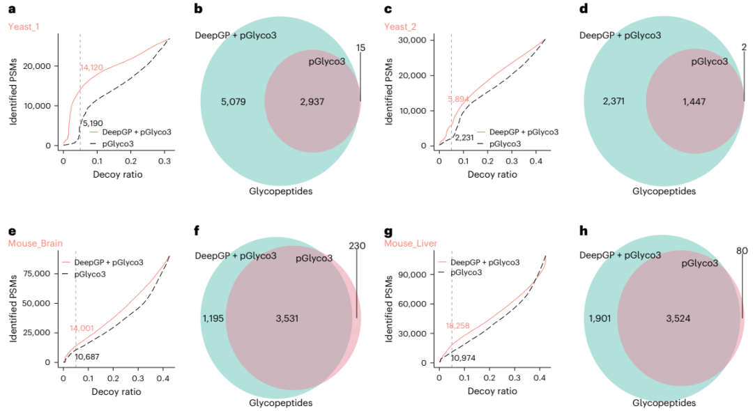 DeepGP 在合成和生物数据集上的全面基准测试验证了其区分相似聚糖的有效性。DeepGP 与数据库搜索相结合可以提高糖肽检测灵敏度。