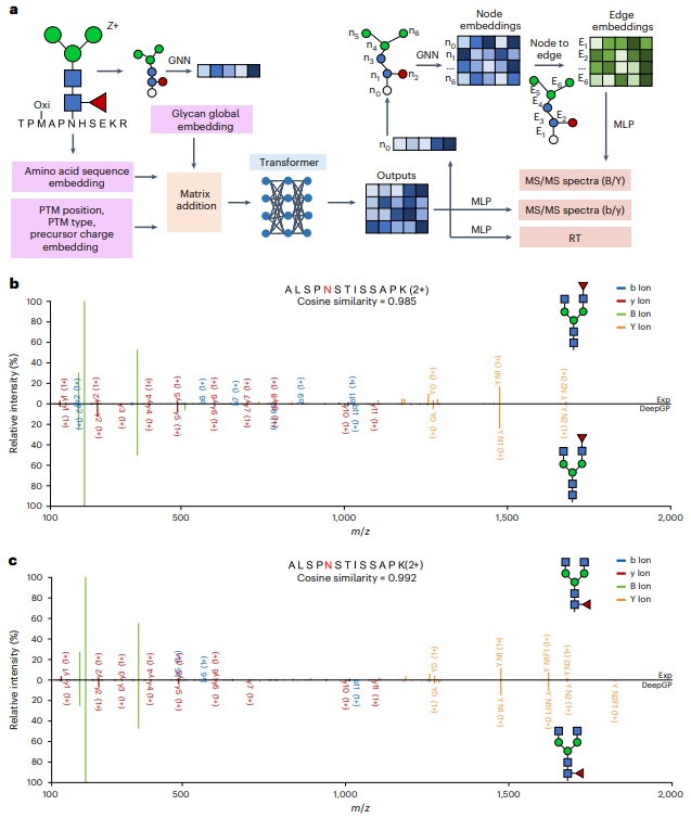 在最新的研究中,复旦大学的研究人员提出了 DeepGP,一种基于 Transformer 和图神经网络的混合深度学习框架,用于预测糖肽的 MS/MS 光谱和保留时间(RT)。