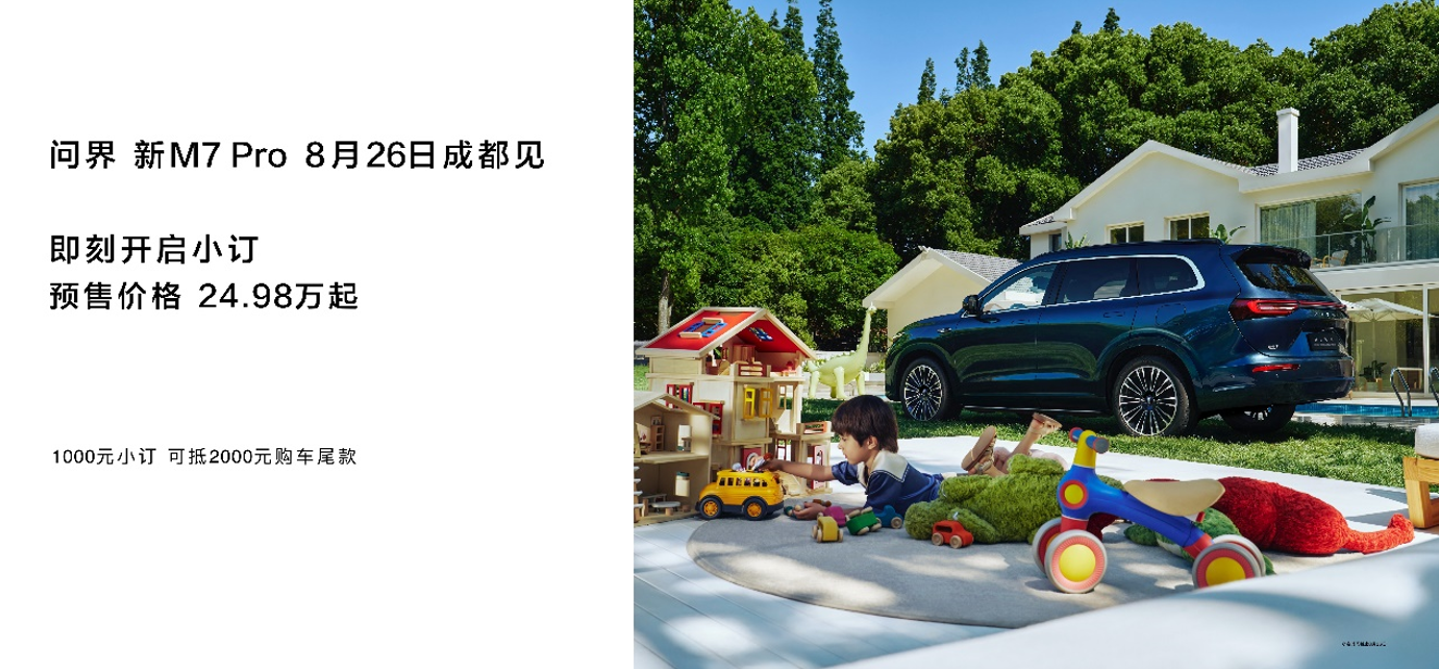 问界新 M7 Pro 预售价 24.98 万起,8 月 26 日前下订即享 1000 元订金抵 2000 元购车尾款小订礼。问界新 M7 Pro 将登陆第二十七届成都国际汽车展览会,并在 8 月 26 日正式上市。