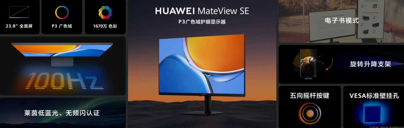与 MateBook GT 14 同期亮相的还有华为星跃鼠标 GT 和华为 MateView SE。其中,华为星跃鼠标 GT 继承了星闪技术,抗干扰能力强,是 HUAWEI MateBook GT 14 的好搭档;华为 MateView SE 则采用 23.8 英寸 1080P 屏幕,屏占比达 92%,是千元档内为数不多支持 90% P3 和 100% sRGB 色域的显示器。用户可在华为商城、各大授权电商平台购买。