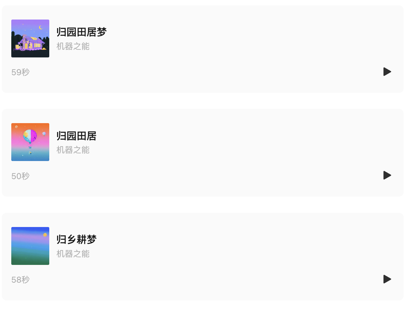 例如,我们输入「不想上班了,想回家种地」,不到 30 秒,三首民谣歌曲就出炉了。