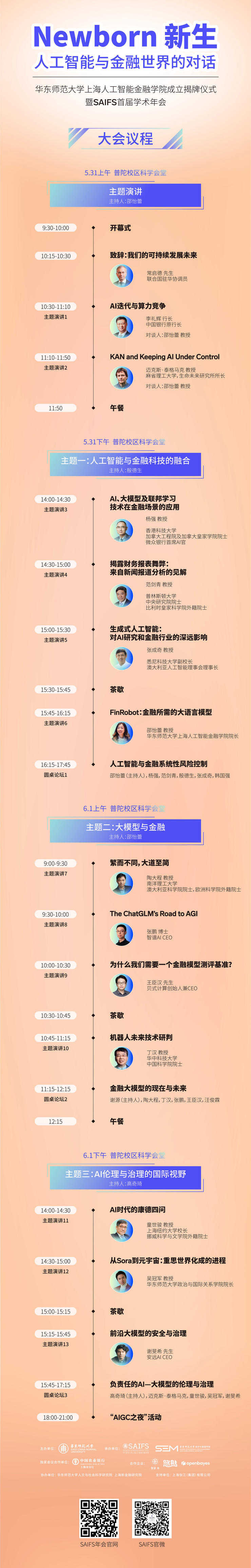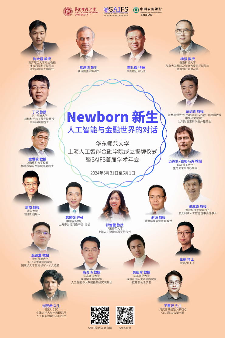 华东师范大学上海人工智能金融学院成立仪式暨 SAIFS 首届学术年会将于 5 月31 日—6 月 1 日在上海举行,在成立仪式后,还邀请到了多位资深专家学者与行业翘楚,将围绕 AI-Fin 的发展趋势与行业创新展开一场精彩的思维碰撞!