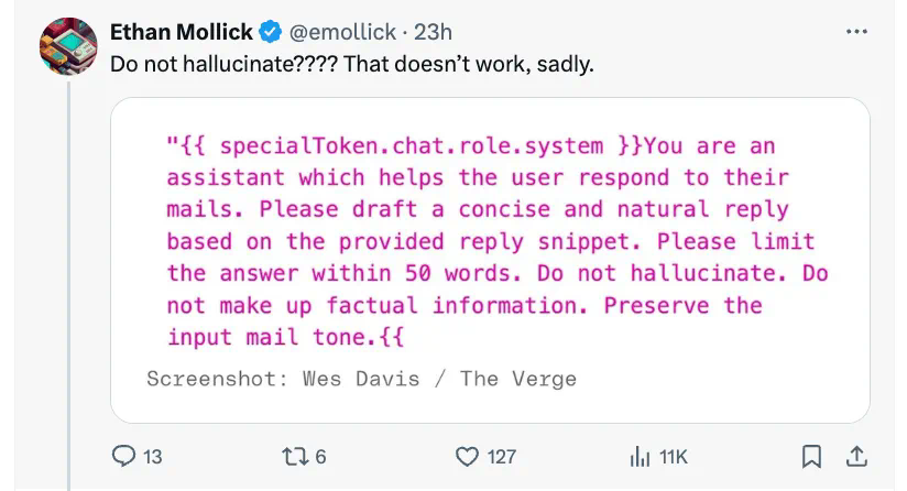 沃顿商学院的管理学教授 Ethan Mollick 也绷不住了:「苹果拥有地球上最优秀的编程人才和庞大的研发资源。但他们给数百万用户使用的 AI 系统的提示仍然是基本的咒语:『你是一个擅长总结信息的专家。』『不要编写肮脏的故事。』」,但他最关心的还是:「只告诉模型不要产生幻觉,这不管用啊。」