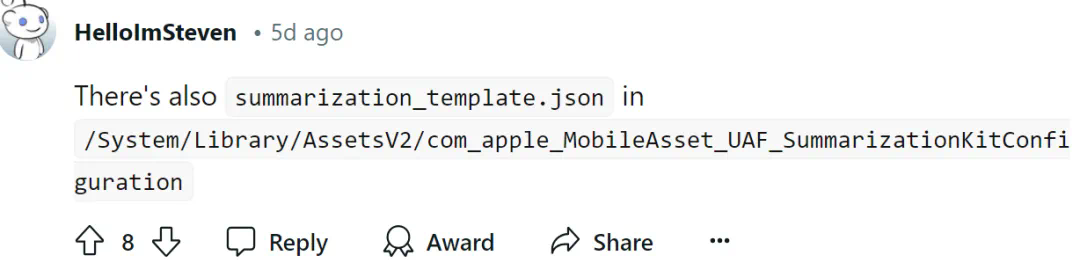 根据 reddit 用户的消息,这些泄露的提示词作为 json 系统文件存在「/System/Library/AssetsV2/com_apple_MobileAsset_UAF_FM_GenerativeModels」目录下。