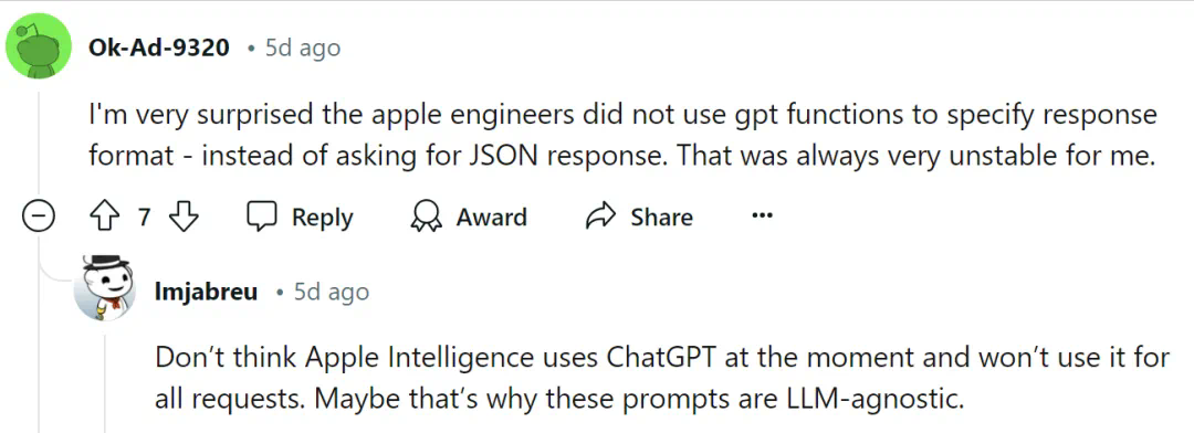 不过,很多网友都惊讶于苹果工程师没有使用 GPT 来指定响应格式 ,而是要求 JSON 。但 JSON 非常不稳定。