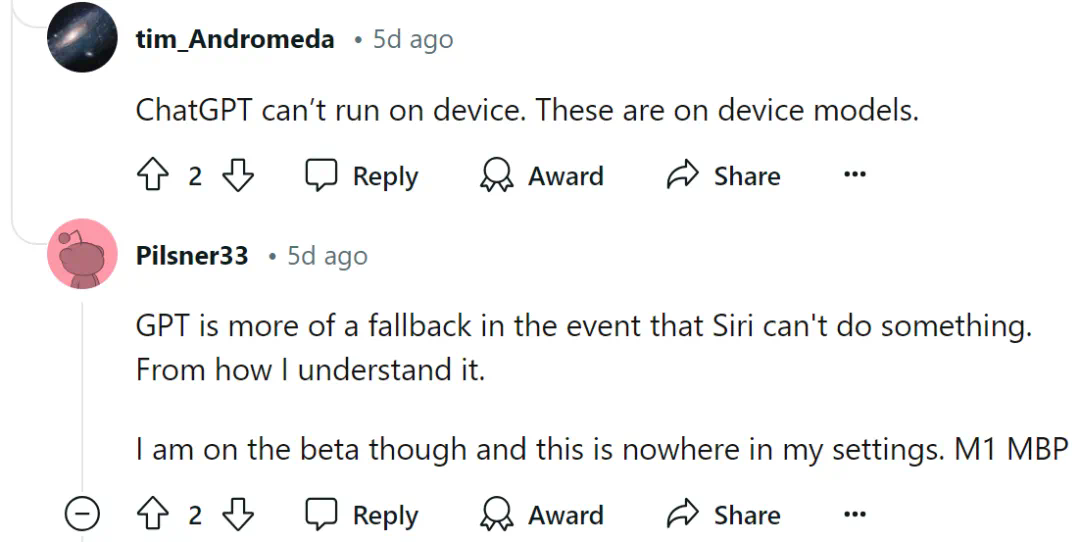 更是有人猜测,GPT 更多的是在 Siri 不能做某事的情况下的备选方案。
