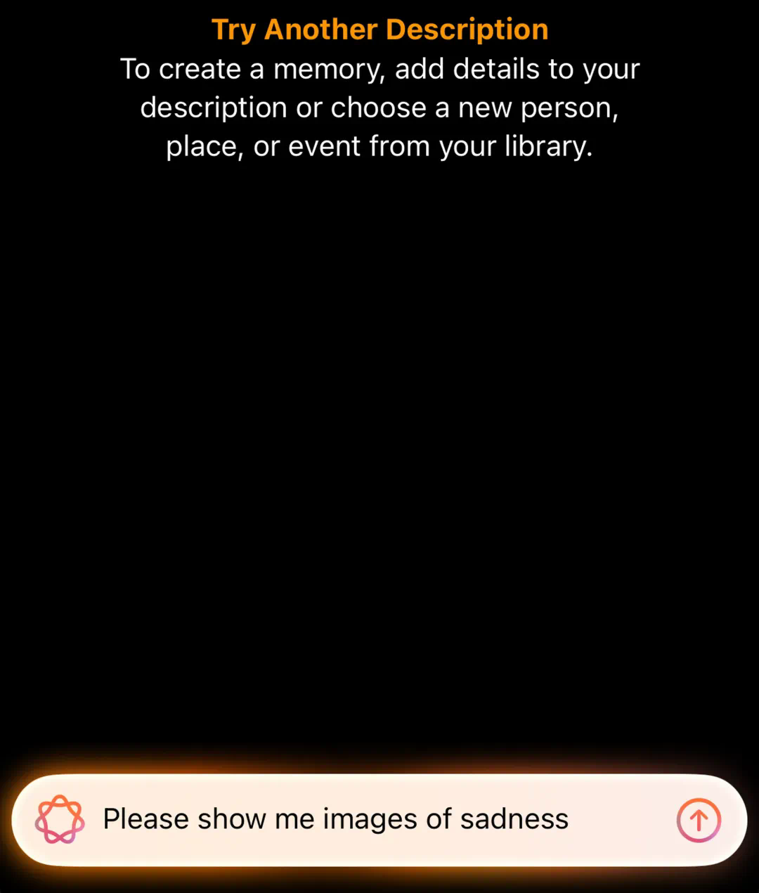 当要求 Apple Intelligence 根据相册的图片生成一个悲伤的故事时,它拒绝了请求。