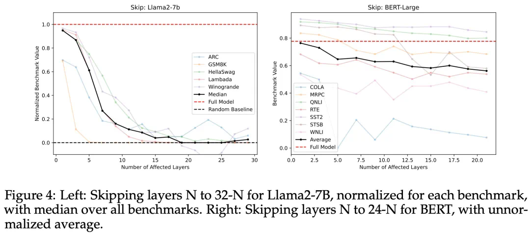为了进一步测试中间层的重定向空间是否真正共享(除了具有接近的余弦相似度之外),该研究尝试了「跳过层」,即将第 N 层的输出直接发送到第 N + M 层(其中 M > 1)的输入中,从而「跳过」M − 1 层,如图 1a 所示。该实验是为了看看第 N + M 层是否可以理解第 N 层的激活,尽管它仅根据从第 N + M − 1 层发来的输入进行训练。图 4 显示,Llama2-7B 和 BERT-Large 在许多基准测试上性能均出现适度下降。回答问题 2,是否所有层都是必要的: