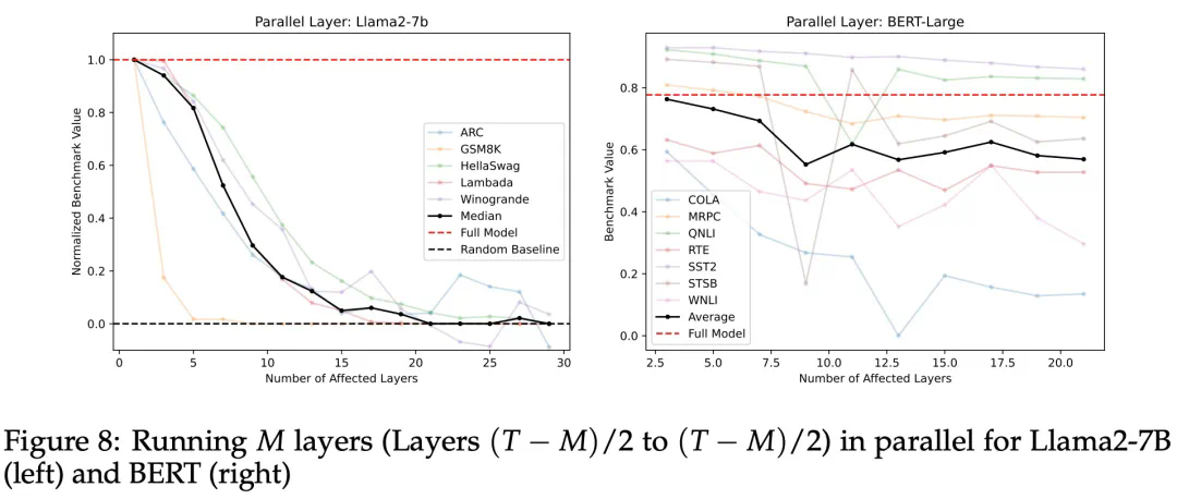 实验结果显示,大部分情况下这种方法都是有效的,只是一些复杂的数学题处理得不太好。这种并行处理方法相比直接跳过一些层,效果更好,但不如按反向顺序运行层的效果出色。基于此,研究者得出结论:并行运行层在一般情况下是可行的,但对于需要顺序逻辑理解的数学问题,这种方法可能不太适用。