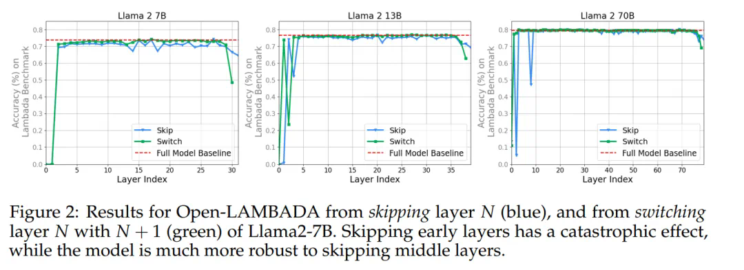在图 2 中,我们可以看到,除了第一层和最后几层之外,Llama2-7B 的各层对跳层或切换层都相当稳健。