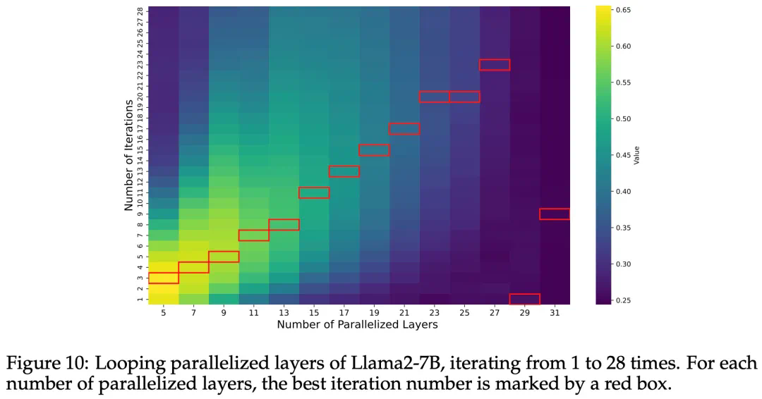 研究者们还针对不同的迭代次数重复了相同的实验。图 10 展示了 Llama2-7B 的性能随并行化层数 M 和迭代次数的变化情况。每个 M 的最高性能迭代次数用红框标出。除了 M=29 和 M=31(几乎并行化所有层)外,最佳迭代次数大致与并行化层数成线性比例。因此,研究者得出的结论是:最佳迭代次数与并行化层数成正比。