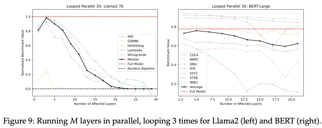 图 9 展示了将并行层循环 3 次的结果。循环并行 3 次的结果显著优于单次迭代(并行层)。起始层 N 设定为 15(针对 Llama2-7B 模型)或 11(针对 BERT 模型)时,即处于每种情况的极左端点,仅有单一的层级受到影响。在这种特定情况下,三次循环并行的效果等同于单纯地将中间层重复三次。与此同时,对于这一点上的并行层而言,其性能与完整模型无异。