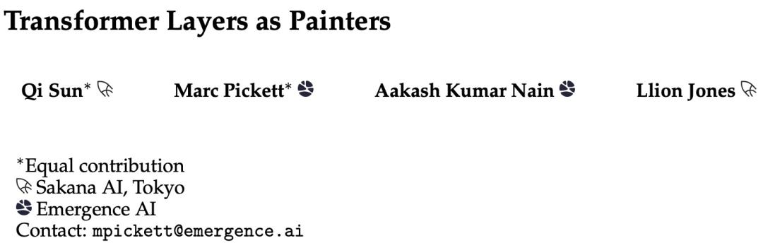 去年,transformer 论文作者之一 Llion Jones 宣布创立人工智能公司 Sakana AI。近期,Sakana AI 发表了一篇题为《Transformer Layers as Painters》的论文,探究了预训练 transformer 中的信息流,并针对仅解码器和仅编码器冻结 transformer 模型进行了一系列实验。请注意,该研究没有对预训练模型进行任何类型的微调。