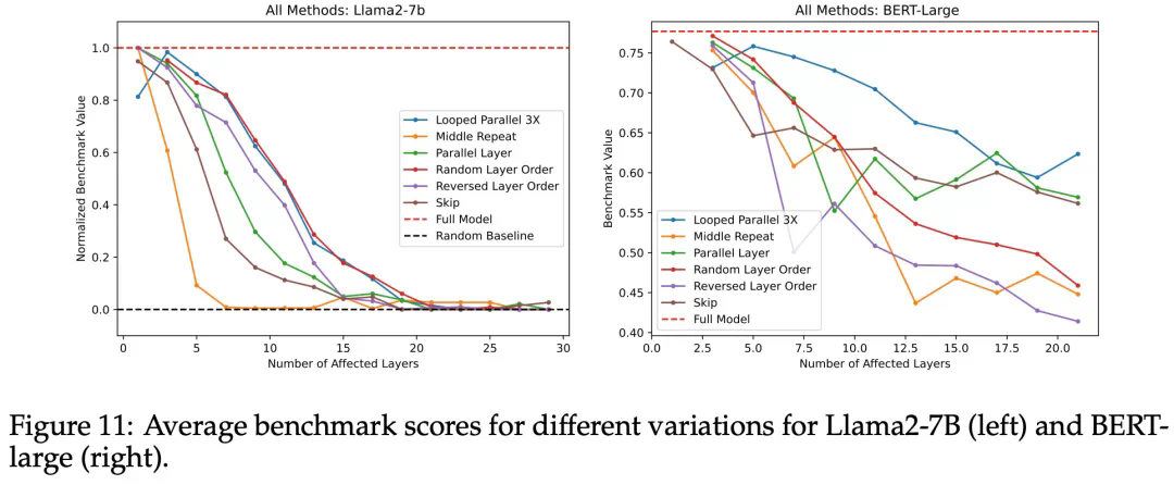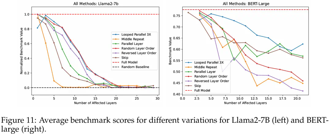中间重复 —— 用相同数量的中间层副本替换中间层 —— 表现最差, 很快就降到了随机基线的性能。相反,循环并行和随机层顺序的影响最小。因此,研究者得出的结论是:重复单一层的影响最严重。随机化层顺序和循环并行的影响最小。
