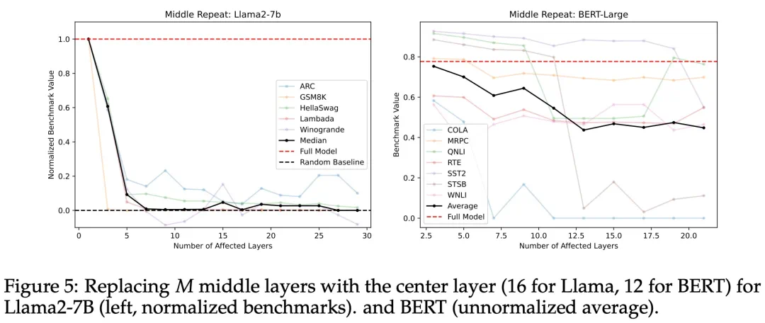如图 5 所示,可以观察到,随着被替换层数的增加,模型在基准测试的得分迅速下降。从后文的图 11 看来,这种替换层的做法比研究者们尝试的其他方法都更糟糕。因此,研究者得出结论:中间层执行的是不同的功能,让中间层之间共享权重并不可行。