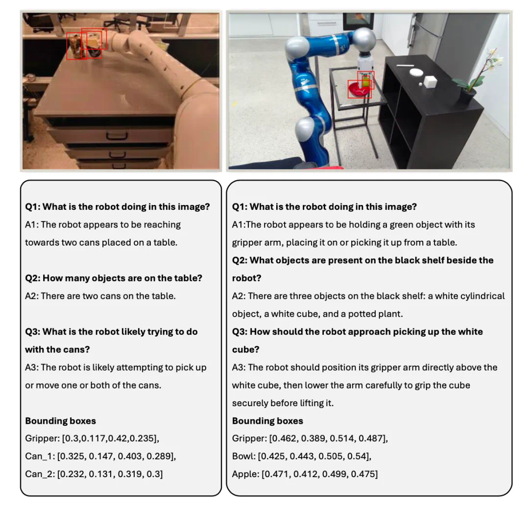 机器人场景理解:描述 Open X-Embodiment 和本文收集的机器人数据中的场景、包含的物体、可能的任务,并人工标注物体、机器人的 bounding box。