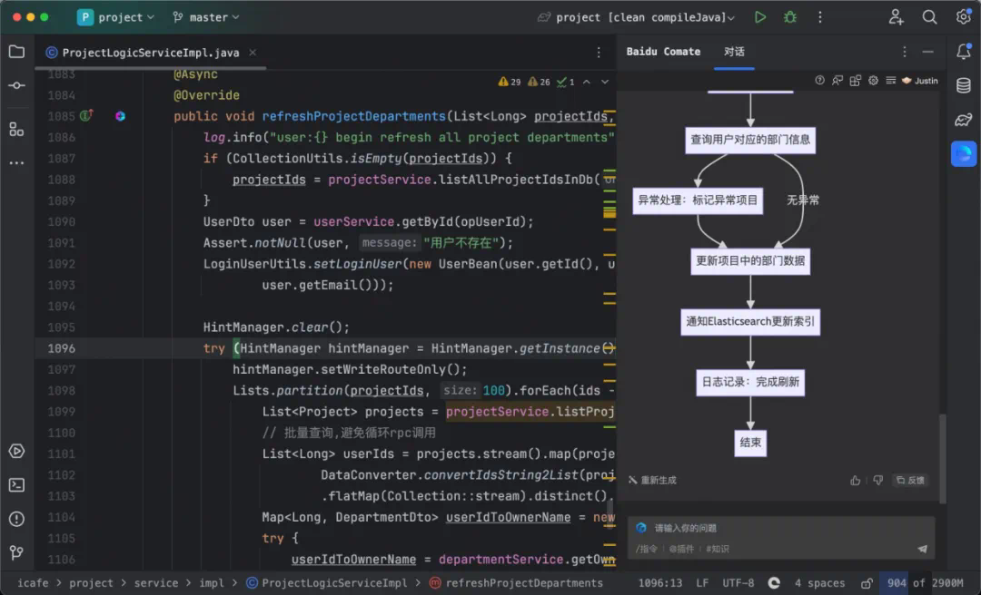 你敢想,AI 已经不满足只做程序员了,如今又向架构师这一进阶职业发起挑战。随着 AI 在研发领域的不断进化,能提供给工程师的助力越来越多,从原先单纯的编码加速器不断延展到架构理解、质量分析、安全扫描、测试生成等更多领域。同时结合 RAG 技术的不断落地应用,对私域知识、本地场景的深刻理解,AI 代码助手的能力边界正在不断被打破。年初,英伟达创始人、CEO 黄仁勋的一番话引发了计算机行业内外的热议。他表示:「生成式 AI 的持续发展大大降低了学习编程的意义,未来人人都可以成为程序员。」无独有偶,百度创始人、CEO 李彦宏也在一次访谈中指出,「这波人工智能的改变可能更加彻底和深刻,基本上以后不会再存在程序员这种职业了。只要会说话,人人都会具备程序员的能力。」两位科技大佬的观点倒不是说未来程序员都会失业,而是在 AI 的帮助下,更多研发行业中非程序员的角色也可以具备基本的开发程序的能力,而具备专业技能的软件工程师们在 AI 助力下将发挥更大的价值。同时,两位科技大佬的观点一定程度上揭示了一个重要趋势:随着大模型赋能的 AI 代码助手在企业业务场景的应用落地,AI 辅助所占的比重越来越高。Stack Overflow 2024 开发者调查报告显示,76% 的受访者正在或计划在开发过程中使用 AI 工具,有好感或非常有好感的比例达到了 72%。国内外大厂都在 AI 代码助手这一赛道重兵投入,而率先入局者已经在自身业务中初见成效,比如百度内部已经有 30%的代码由其智能代码助手「文心快码 Baidu Comate」生成。说到文心快码(Baidu Comate),它还是在 6 月底百度 WAVE SUMMIT 深度学习开发者大会上拥有了自己的中文名,并升级到了 2.5 版本。算起来,自 2023 年 4 月推出以来,文心快码已经是一位「练习时长快一年半」的 AI 程序员了。在岗这么长时间,文心快码现已支持了 C/C++、Java 等 100 多种编程语言和 VS Code、Jetbrains 系列等 19 款主流 IDE 平台,能够续写已有代码、利用自然语言指令生成代码、根据注释写代码并在代码基础上生成注释。我们观察到,百度内部已经有 80%的工程师在深度使用文心快码。而随着基础模型能力的持续提升以及 AI 代码助手在工作中越来越驾轻就熟,其自身能力也在不断进化。这不,百度文心快码不满足只干程序员的活了,它表现出来的一些能力正在告诉人们:自己甚至可以胜任架构师的角色了!不过,在揭秘文心快码的「进阶能力」之前,我们有必要先来了解一下程序员与架构师的区别。AI 程序员的职业晋升做专才更要通才如果说程序员是某一技术领域的专才(如前端、后端、移动应用开发),架构师则可以称得上多个技术领域的通才了,他们要在软件开发、系统架构、网络通信、数据库设计等方面都玩得转。从职能上看,程序员侧重于在实现层面执行编写代码、调试与测试、维护等具体任务,而架构师主要负责整体系统的设计和规划,包括系统架构、模块划分、技术选型等,还要做出技术决策并指导团队。因此,程序员晋升为架构师需要全方位的提升。同样地,AI 代码助手要想成功地将自身角色从程序员跨越到架构师,必然要在承担的职责、具备的技能方面更上一个台阶。文心快码既然宣称升级成为了「互联网首位 AI 架构师」,想必已经掌握了承担相应角色与任务的必备技能。自落地百度内部以来,文心快码在完成常见编程任务方面自不必多说,代码采纳率也达到了 46%。随着向架构师角色的转变,如今的文心快码更懂业务架构、更懂测试、更懂领域知识、更能解决代码编程中的疑难问题。首要一点便是能更高效地解决编程中的架构问题,它们往往涉及到系统的层次结构、模块划分、控制流和数据流等方面。人类架构师统筹起来尚且不容易,而文心快码在拥有了架构师的能力后,可以通过代码解释,快速了解函数在「真实业务背景下的含义」。不仅如此,为了更清楚地洞见编程逻辑框架、项目管理全流程,文心快码还能通过流程图的方式,直观地展示完整的调用逻辑。其次代码质量也是架构师关注的关键领域,而单元测试(UT)则是保障代码质量的关键举措,以确保系统稳定性和可靠性。文心快码在单元测试生成方面迎来全面强化,不仅 UT 生成效果大幅提升,生成的 UT 用例更是达到了 100% 有效。做到这些要归功于文心快码自动识别工程所使用的测试框架版本,它能够自动识别被测方法跨文件依赖,并自动参考已有单元测试书写风格,因而可以生成更贴近真实场景、效果更优、可用性更强的单元测试代码。同时得益于文心快码四层架构的 AI 优化,UT 生成速度同样大幅提升。即使面对复杂的函数,平均 6 秒就能自动生成可用单元测试,缩短了等待加载时间。