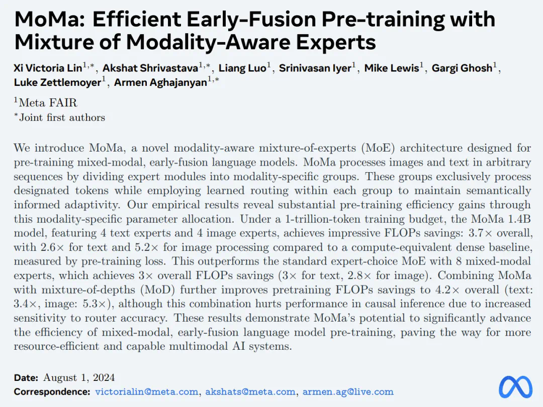 论文标题:MoMa: Efficient Early-Fusion Pre-training with Mixture of Modality-Aware Experts -