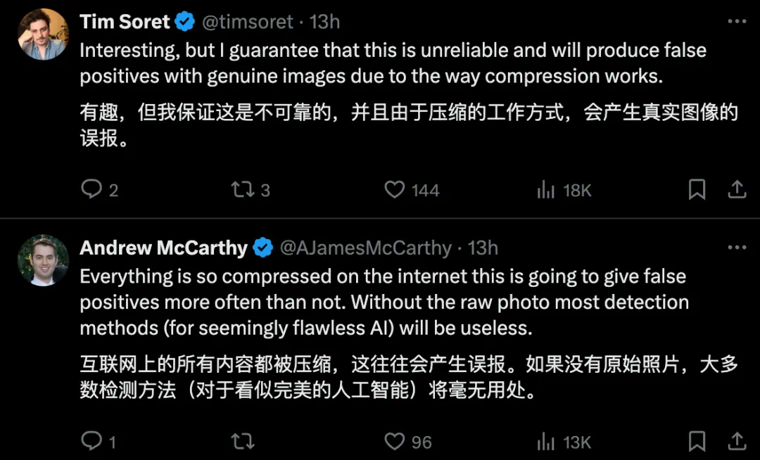 这小哥解释称,如果是经过 JPG 格式压缩的真实图片,也可能会出现色彩断裂的现象。