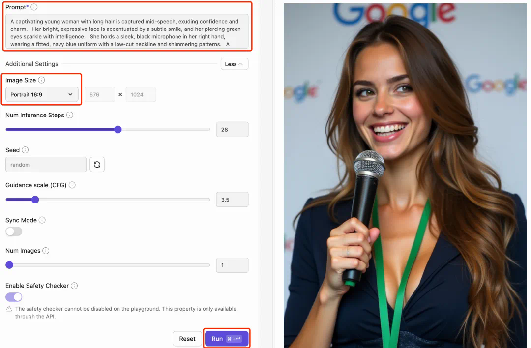我们首先使用 AI 生图工具 FLUX 制作小姐姐演讲的图片。