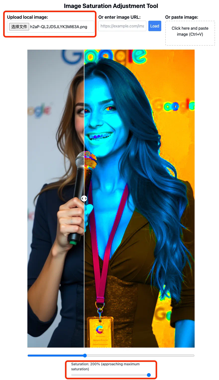 我们也去体验了一番,只需上传一张图片,然后将饱和度拉到最大值,就能看到 AI 生成图像中的 bug。
