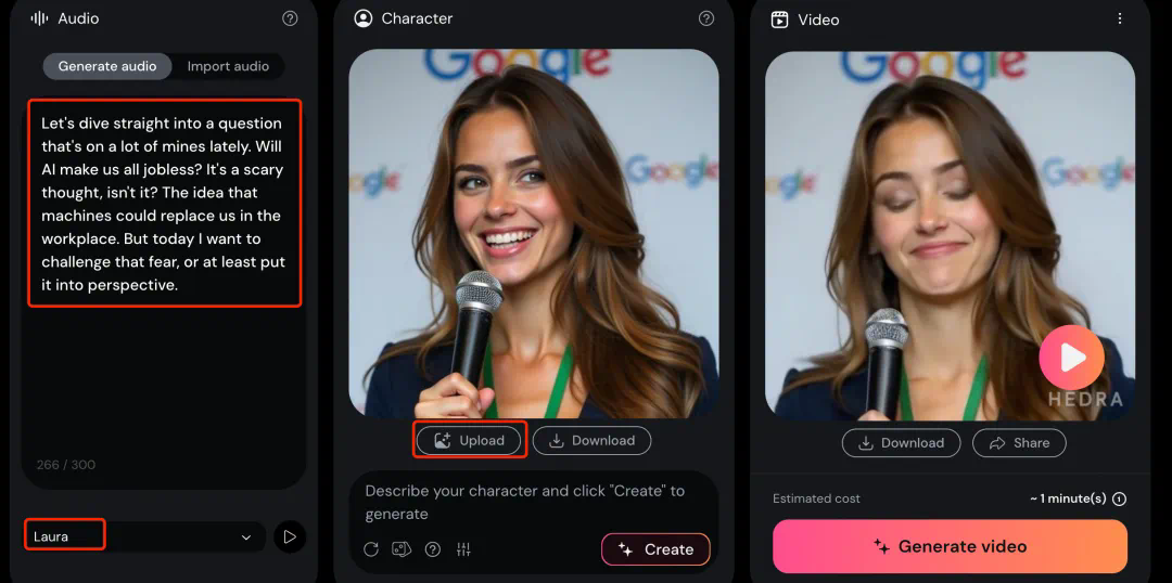 当然,我们也可以使用另一款 AI 对口型应用 ——Hedra,玩法与 Sync 类似。(查看详情,请移步:吊打阿里 EMO?让马斯克唱 Rap、奥特曼说脱口秀的 AI 神器出圈,人人免费可用)