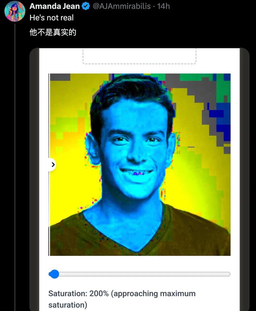 其原理就是,提高图片饱和度,并仔细观察麦克风的斑点和牙齿,就能检测图像是否由 AI 生成。