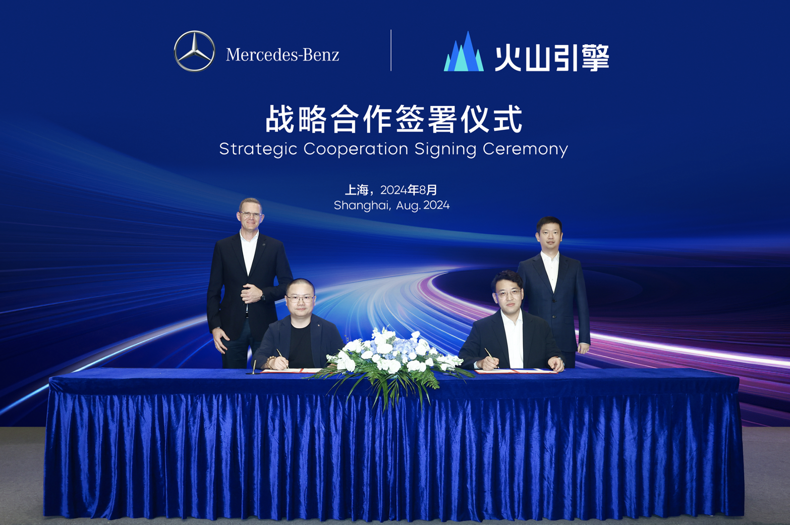 8月13日,梅赛德斯-奔驰(中国)投资有限公司(以下简称“梅赛德斯-奔驰中国”)与北京火山引擎科技有限公司(以下简称“火山引擎”)双方官宣签署战略合作备忘录,以前沿AI科技加持智能座舱技术发展,在大模型、生成式人工智能和大数据等领域开展探索和合作,以“中国速度” 为中国客户带来数字豪华的产品和科技。