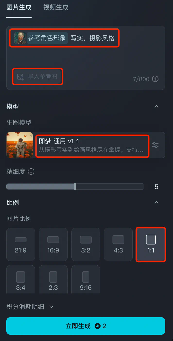 输入提示词:写实,摄影风格。选择生图模型即梦通用 v1.4 以及图片比例。