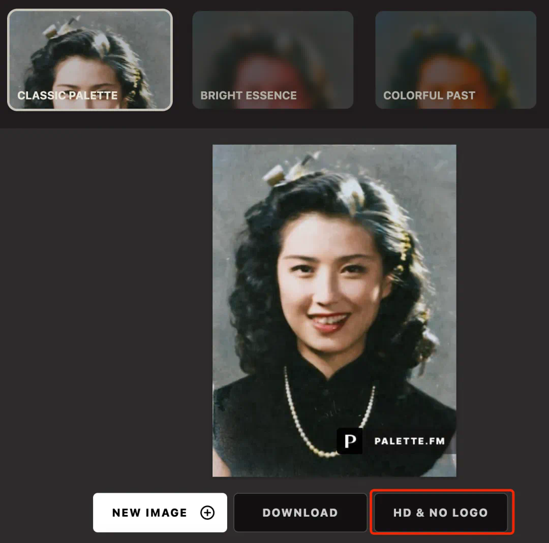 我们上传一张民国时期女演员胡枫的黑白照片,选择「Classic Palette」滤镜,眨巴眼的工具就能完成调色。