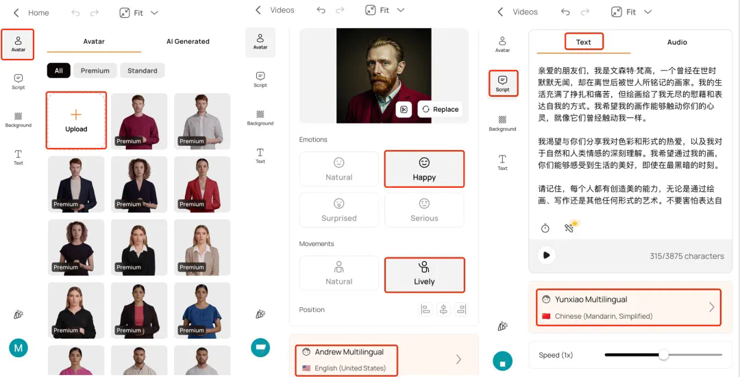 其玩法也很简单。只需上传一张图片,然后设置表情、动作、姿势、声音以及输入所说内容即可。