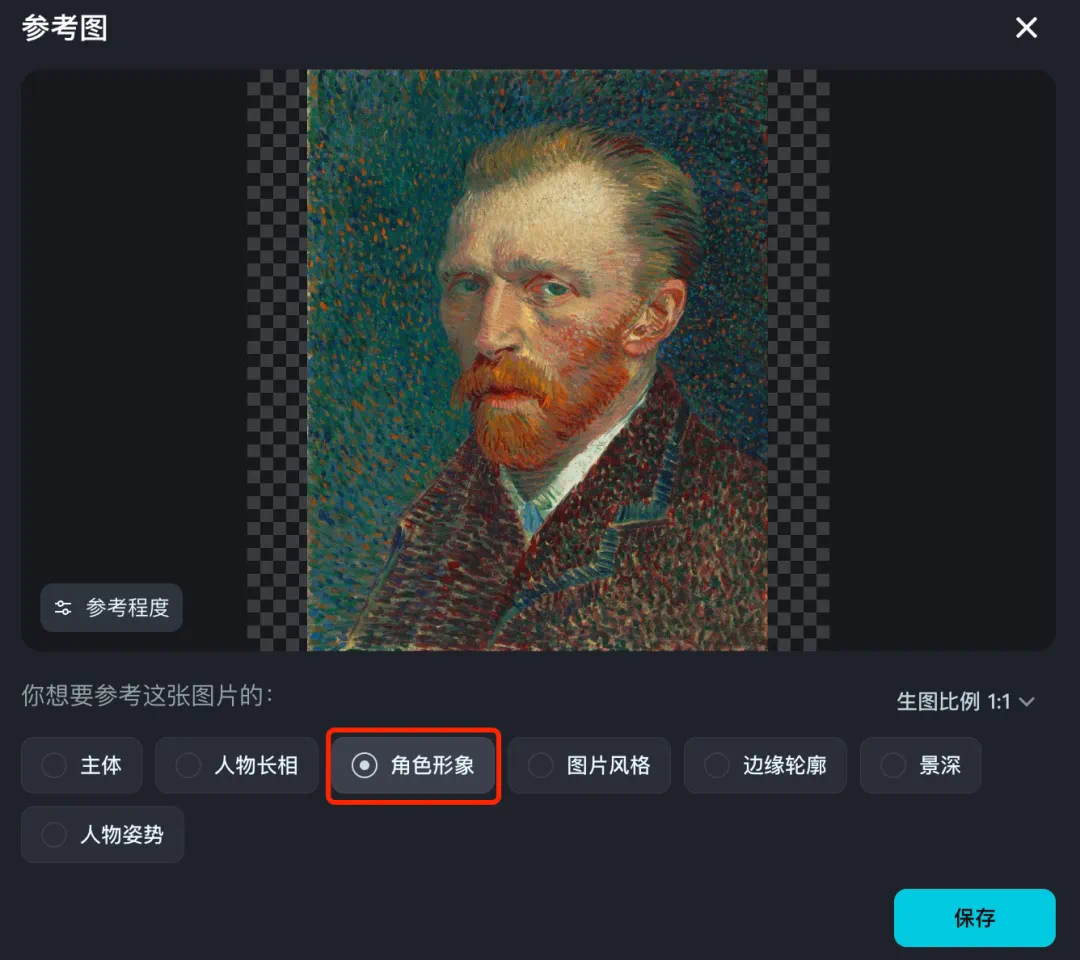 我们以梵高为例。导入参考图,选择「角色形象」。