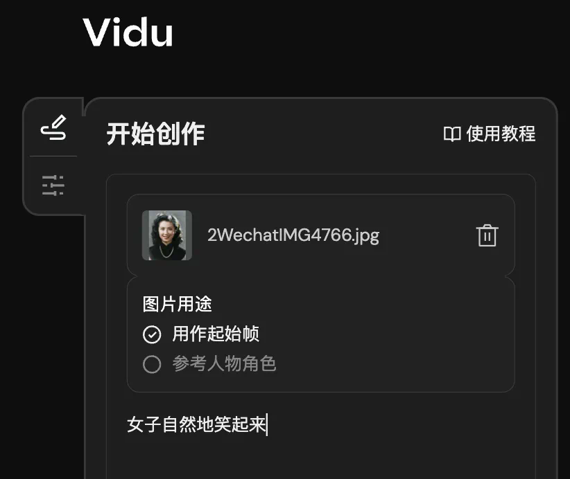接下来,我们使用Vidu让画面动起来。提示词为:女子自然地笑起来。