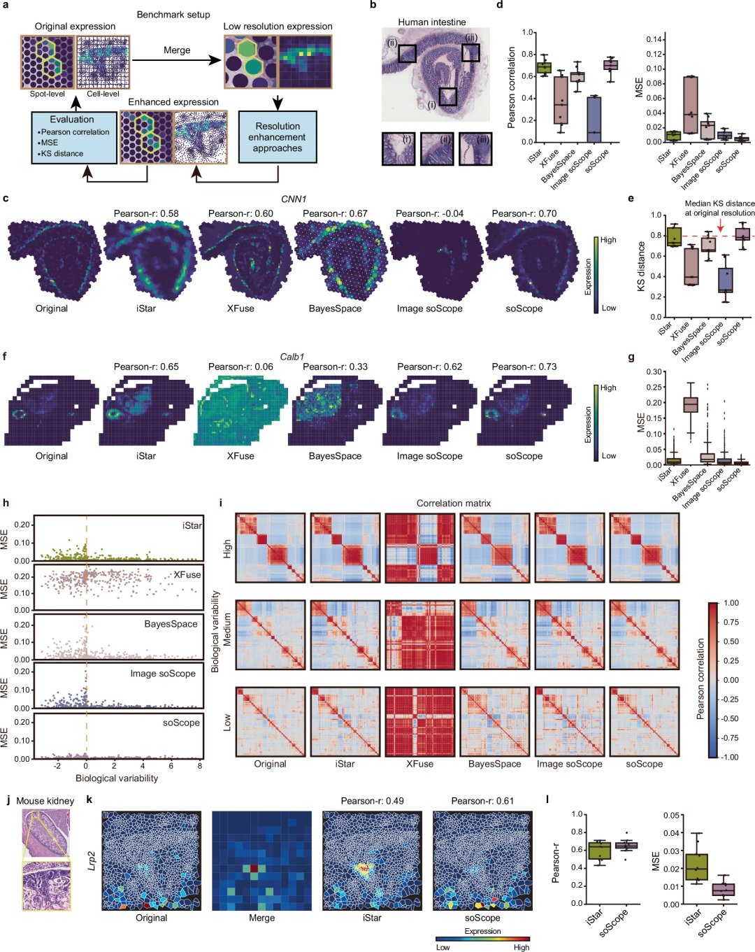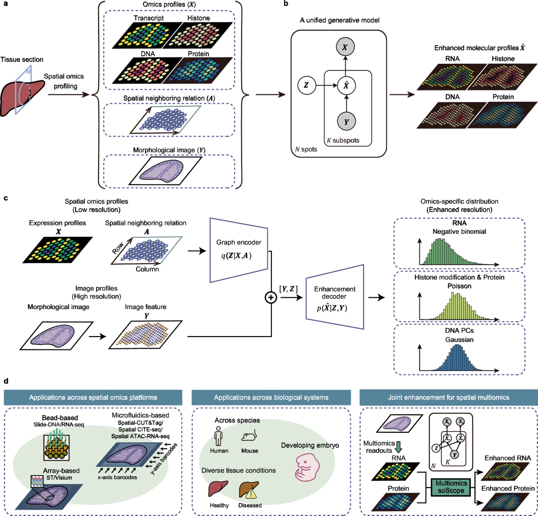 在健康和患病组织中,soScope 改进了组织域识别,提高了已知标记的可区分性,并纠正了数据和技术偏差。该方法能够揭示比原始分辨率高出 36 倍的更精细的组织结构。它可以有效地适应空间多组学数据,以同时增强多组学概况。