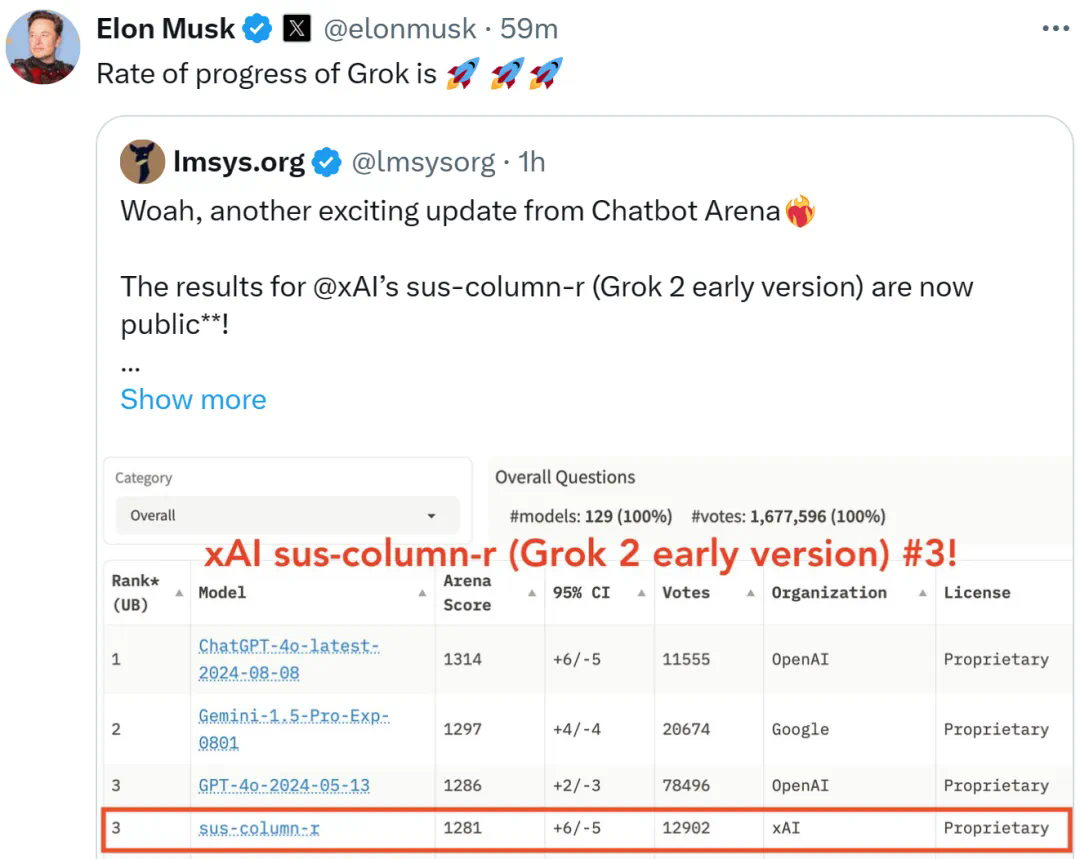 Grok-2来了,能生图识图、性能比肩GPT-4o,马斯克:发展猛如火箭