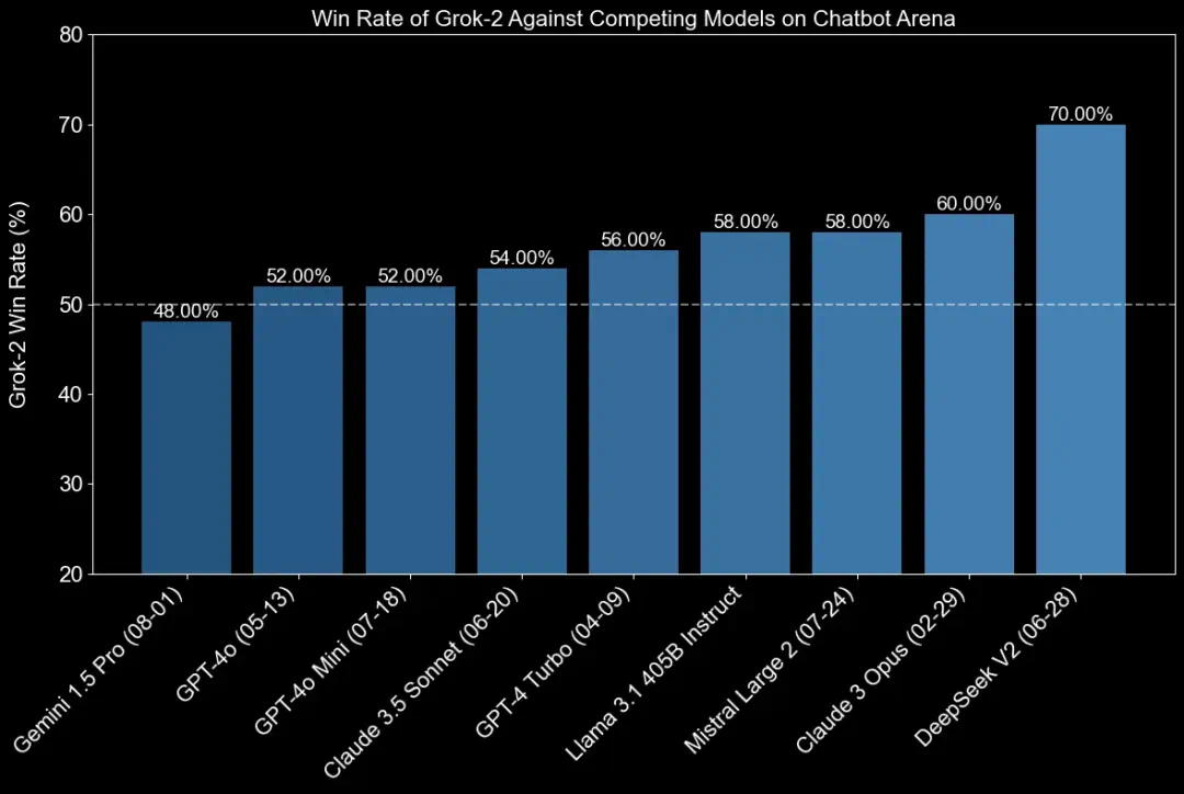 下图为 Grok-2 与其他流行模型的胜率(Win Rate)比较。