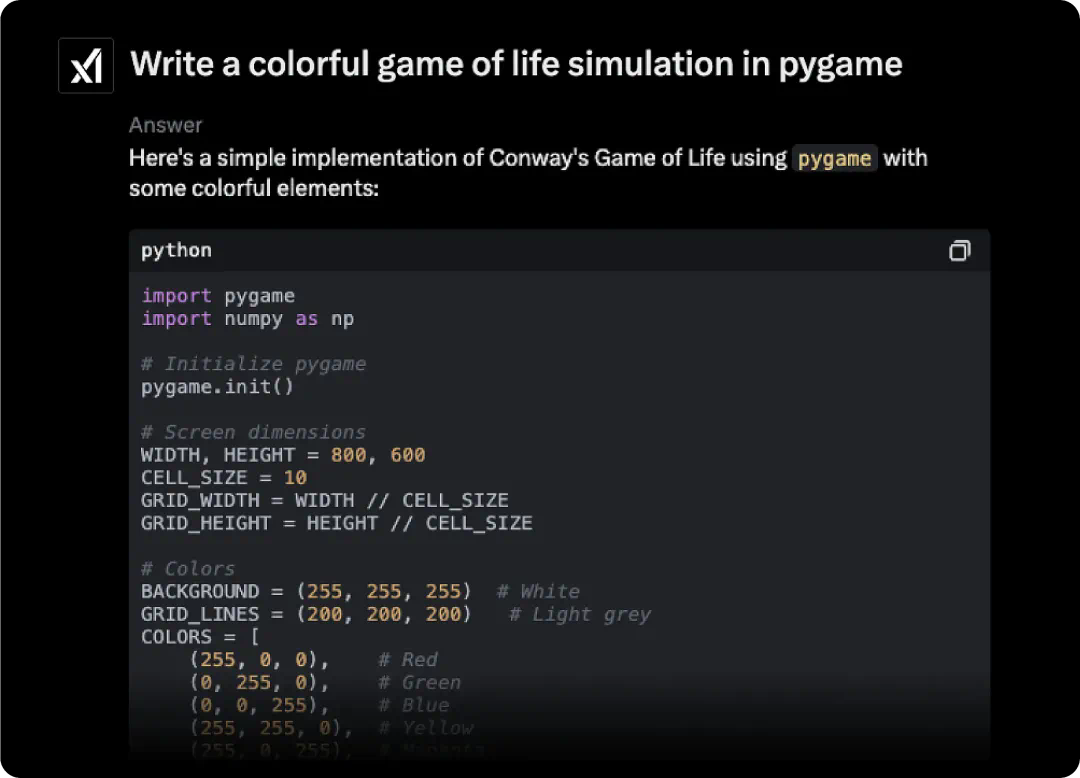 当然,xAI 提供了一些新功能,比如 Conway《生命游戏》的简单实现。