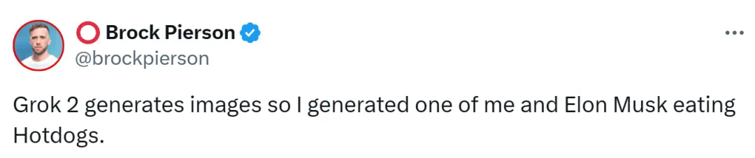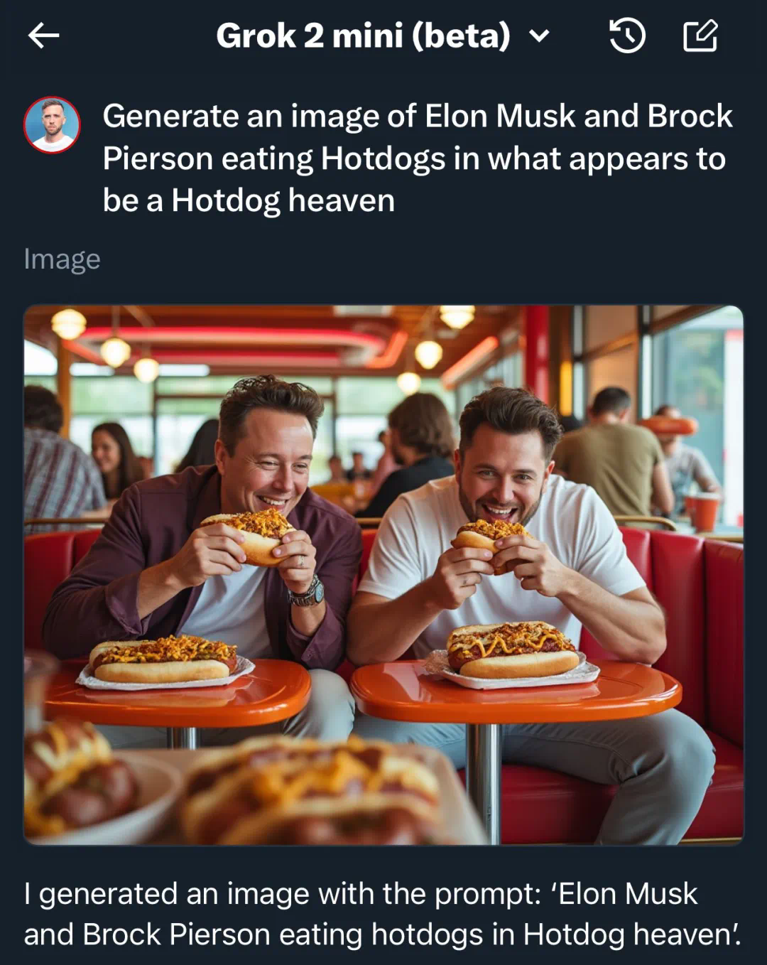 新模型发布后不到半小时,已经有网友在晒使用效果了,他使用 Grok 2 mini 生成了一张「我与马斯克吃热狗」的图像。